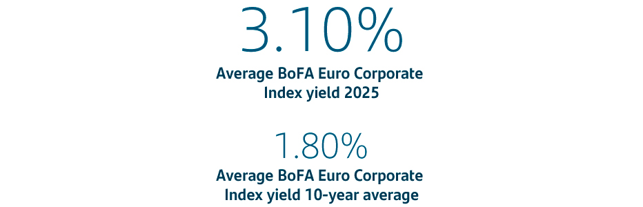 We maintain a positive view on Eurozone investment-grade credit for 2026. Yields remain attractive -well above the 10-year and 20-year averages- and offer an additional premium over sovereign debt. Strong demand, particularly from retail investors, and robust corporate balance sheets leave room for further spread tightenings.